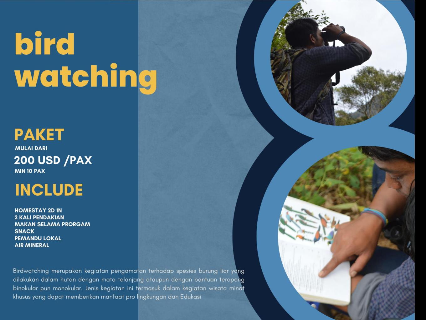 Birdwatching merupakan kegiatan pengamatan terhadap spesies burung liar yang dilakukan dalam hutan dengan mata telanjang ataupun dengan bantuan teropong binokular pun monokular. Jenis kegiatan ini termasuk dalam kegiatan wisata minat khusus yang dapat memberikan manfaat pro lingkungan dan Edukas